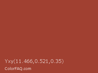 Yxy 11.466,0.521,0.35 Color is a normal red color and the nearest color is Sweet Brown #a83731. Hex code #a14031 and RGB value is rgb(161,64,49). In RGB color space, this color is composed of 63% red, 25% green, 19% blue, In CMYK color space, this color is composed of 0% cyan, 60% magenta, 70% yellow , 37% black , In HSL color space, this color has a hue angle of 8° , 53% saturation and 41% lightness.