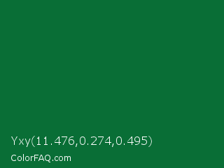 Yxy 11.476,0.274,0.495 Color is a dark green color and the nearest color is Fun Green #016d39. Hex code #096e36 and RGB value is rgb(9,110,54). In RGB color space, this color is composed of 4% red, 43% green, 21% blue, In CMYK color space, this color is composed of 92% cyan, 0% magenta, 51% yellow , 57% black , In HSL color space, this color has a hue angle of 147° , 85% saturation and 23% lightness.