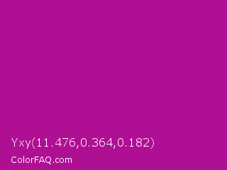 Yxy 11.476,0.364,0.182 Color is a normal magenta color and the nearest color is Violet Eggplant #991199. Hex code #ae0f93 and RGB value is rgb(174,15,147). In RGB color space, this color is composed of 68% red, 6% green, 58% blue, In CMYK color space, this color is composed of 0% cyan, 91% magenta, 16% yellow , 32% black , In HSL color space, this color has a hue angle of 310° , 84% saturation and 37% lightness.