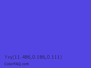 Yxy 11.486,0.186,0.111 Color is a normal indigo color and the nearest color is Majorelle Blue #6050dc. Hex code #5245e1 and RGB value is rgb(82,69,225). In RGB color space, this color is composed of 32% red, 27% green, 88% blue, In CMYK color space, this color is composed of 64% cyan, 69% magenta, 0% yellow , 12% black , In HSL color space, this color has a hue angle of 245° , 72% saturation and 58% lightness.