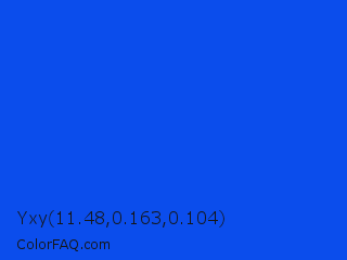 Yxy 11.48,0.163,0.104 Color is a normal blue color and the nearest color is Blue RYB #0247fe. Hex code #0b4dec and RGB value is rgb(11,77,236). In RGB color space, this color is composed of 4% red, 30% green, 93% blue, In CMYK color space, this color is composed of 95% cyan, 67% magenta, 0% yellow , 7% black , In HSL color space, this color has a hue angle of 222° , 91% saturation and 48% lightness.