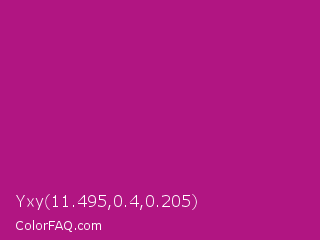 Yxy 11.495,0.4,0.205 Color is a normal magenta color and the nearest color is Red Violet #c71585. Hex code #b11582 and RGB value is rgb(177,21,130). In RGB color space, this color is composed of 69% red, 8% green, 51% blue, In CMYK color space, this color is composed of 0% cyan, 88% magenta, 27% yellow , 31% black , In HSL color space, this color has a hue angle of 318° , 79% saturation and 39% lightness.