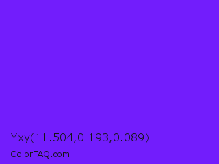 Yxy 11.504,0.193,0.089 Color is a normal violet color and the nearest color is Electric Indigo #6f00ff. Hex code #721dfc and RGB value is rgb(114,29,252). In RGB color space, this color is composed of 45% red, 11% green, 99% blue, In CMYK color space, this color is composed of 55% cyan, 88% magenta, 0% yellow , 1% black , In HSL color space, this color has a hue angle of 263° , 97% saturation and 55% lightness.
