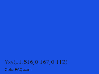 Yxy 11.516,0.167,0.112 Color is a normal blue color and the nearest color is Palatinate Blue #273be2. Hex code #1950e3 and RGB value is rgb(25,80,227). In RGB color space, this color is composed of 10% red, 31% green, 89% blue, In CMYK color space, this color is composed of 89% cyan, 65% magenta, 0% yellow , 11% black , In HSL color space, this color has a hue angle of 224° , 80% saturation and 49% lightness.