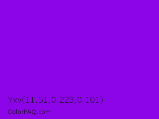 Yxy 11.51,0.223,0.101 Color is a normal purple color and the nearest color is Dark Violet #9400d3. Hex code #8c05e8 and RGB value is rgb(140,5,232). In RGB color space, this color is composed of 55% red, 2% green, 91% blue, In CMYK color space, this color is composed of 40% cyan, 98% magenta, 0% yellow , 9% black , In HSL color space, this color has a hue angle of 276° , 96% saturation and 46% lightness.