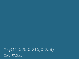 Yxy 11.526,0.215,0.258 Color is a normal blue color and the nearest color is Blue Sapphire #126180. Hex code #236684 and RGB value is rgb(35,102,132). In RGB color space, this color is composed of 14% red, 40% green, 52% blue, In CMYK color space, this color is composed of 73% cyan, 23% magenta, 0% yellow , 48% black , In HSL color space, this color has a hue angle of 199° , 58% saturation and 33% lightness.