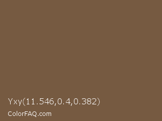 Yxy 11.546,0.4,0.382 Color is a normal orange color and the nearest color is Tobacco Brown #715d47. Hex code #765a41 and RGB value is rgb(118,90,65). In RGB color space, this color is composed of 46% red, 35% green, 25% blue, In CMYK color space, this color is composed of 0% cyan, 24% magenta, 45% yellow , 54% black , In HSL color space, this color has a hue angle of 28° , 29% saturation and 36% lightness.
