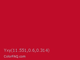 Yxy 11.551,0.6,0.314 Color is a normal red color and the nearest color is Red NCS #c40233. Hex code #bf0d29 and RGB value is rgb(191,13,41). In RGB color space, this color is composed of 75% red, 5% green, 16% blue, In CMYK color space, this color is composed of 0% cyan, 93% magenta, 79% yellow , 25% black , In HSL color space, this color has a hue angle of 351° , 87% saturation and 40% lightness.