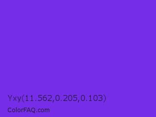 Yxy 11.562,0.205,0.103 Color is a normal violet color and the nearest color is Blue Violet #8a2be2. Hex code #762de8 and RGB value is rgb(118,45,232). In RGB color space, this color is composed of 46% red, 18% green, 91% blue, In CMYK color space, this color is composed of 49% cyan, 81% magenta, 0% yellow , 9% black , In HSL color space, this color has a hue angle of 263° , 80% saturation and 54% lightness.