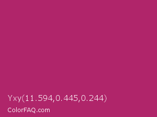 Yxy 11.594,0.445,0.244 Color is a normal rose color and the nearest color is Hibiscus #b6316c. Hex code #b0256a and RGB value is rgb(176,37,106). In RGB color space, this color is composed of 69% red, 15% green, 42% blue, In CMYK color space, this color is composed of 0% cyan, 79% magenta, 40% yellow , 31% black , In HSL color space, this color has a hue angle of 330° , 65% saturation and 42% lightness.