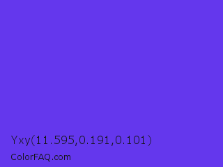 Yxy 11.595,0.191,0.101 Color is a normal indigo color and the nearest color is Majorelle Blue #6050dc. Hex code #6437ed and RGB value is rgb(100,55,237). In RGB color space, this color is composed of 39% red, 22% green, 93% blue, In CMYK color space, this color is composed of 58% cyan, 77% magenta, 0% yellow , 7% black , In HSL color space, this color has a hue angle of 255° , 83% saturation and 57% lightness.