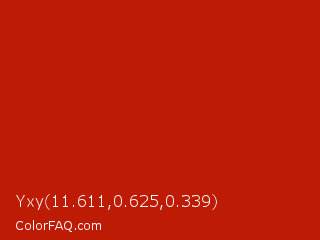 Yxy 11.611,0.625,0.339 Color is a normal red color and the nearest color is International Orange Engineering #ba160c. Hex code #bd1b04 and RGB value is rgb(189,27,4). In RGB color space, this color is composed of 74% red, 11% green, 2% blue, In CMYK color space, this color is composed of 0% cyan, 86% magenta, 98% yellow , 26% black , In HSL color space, this color has a hue angle of 7° , 96% saturation and 38% lightness.