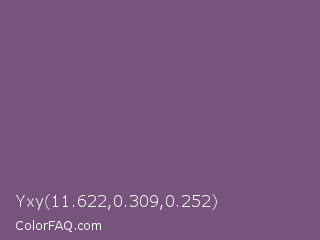Yxy 11.622,0.309,0.252 Color is a normal magenta color and the nearest color is Old Lavender #796878. Hex code #76547b and RGB value is rgb(118,84,123). In RGB color space, this color is composed of 46% red, 33% green, 48% blue, In CMYK color space, this color is composed of 4% cyan, 32% magenta, 0% yellow , 52% black , In HSL color space, this color has a hue angle of 292° , 19% saturation and 41% lightness.