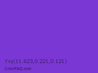 Yxy 11.623,0.221,0.121 Color is a normal violet color and the nearest color is Blue Violet #8a2be2. Hex code #7a37d4 and RGB value is rgb(122,55,212). In RGB color space, this color is composed of 48% red, 22% green, 83% blue, In CMYK color space, this color is composed of 42% cyan, 74% magenta, 0% yellow , 17% black , In HSL color space, this color has a hue angle of 266° , 65% saturation and 52% lightness.