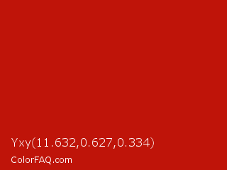 Yxy 11.632,0.627,0.334 Color is a normal red color and the nearest color is International Orange Engineering #ba160c. Hex code #bf1409 and RGB value is rgb(191,20,9). In RGB color space, this color is composed of 75% red, 8% green, 4% blue, In CMYK color space, this color is composed of 0% cyan, 90% magenta, 95% yellow , 25% black , In HSL color space, this color has a hue angle of 4° , 91% saturation and 39% lightness.