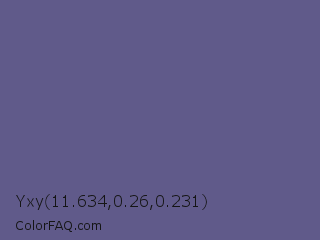 Yxy 11.634,0.26,0.231 Color is a normal indigo color and the nearest color is Butterfly Bush #624e9a. Hex code #605a8a and RGB value is rgb(96,90,138). In RGB color space, this color is composed of 38% red, 35% green, 54% blue, In CMYK color space, this color is composed of 30% cyan, 35% magenta, 0% yellow , 46% black , In HSL color space, this color has a hue angle of 248° , 21% saturation and 45% lightness.
