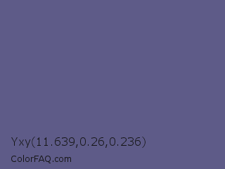 Yxy 11.639,0.26,0.236 Color is a normal indigo color and the nearest color is Dolphin #646077. Hex code #5e5b88 and RGB value is rgb(94,91,136). In RGB color space, this color is composed of 37% red, 36% green, 53% blue, In CMYK color space, this color is composed of 31% cyan, 33% magenta, 0% yellow , 47% black , In HSL color space, this color has a hue angle of 244° , 20% saturation and 45% lightness.
