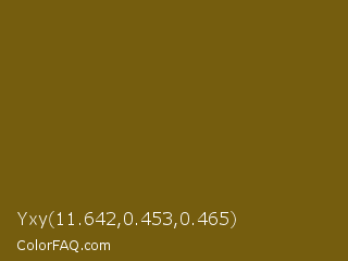 Yxy 11.642,0.453,0.465 Color is a dark yellow color and the nearest color is Spicy Mustard #74640d. Hex code #755d0e and RGB value is rgb(117,93,14). In RGB color space, this color is composed of 46% red, 36% green, 5% blue, In CMYK color space, this color is composed of 0% cyan, 21% magenta, 88% yellow , 54% black , In HSL color space, this color has a hue angle of 46° , 79% saturation and 26% lightness.
