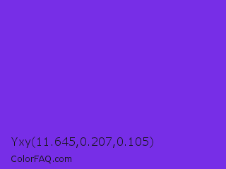 Yxy 11.645,0.207,0.105 Color is a normal violet color and the nearest color is Blue Violet #8a2be2. Hex code #772ee7 and RGB value is rgb(119,46,231). In RGB color space, this color is composed of 47% red, 18% green, 91% blue, In CMYK color space, this color is composed of 48% cyan, 80% magenta, 0% yellow , 9% black , In HSL color space, this color has a hue angle of 264° , 79% saturation and 54% lightness.