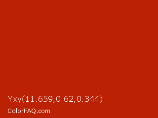 Yxy 11.659,0.62,0.344 Color is a normal red color and the nearest color is International Orange Engineering #ba160c. Hex code #bb2103 and RGB value is rgb(187,33,3). In RGB color space, this color is composed of 73% red, 13% green, 1% blue, In CMYK color space, this color is composed of 0% cyan, 82% magenta, 98% yellow , 27% black , In HSL color space, this color has a hue angle of 10° , 97% saturation and 37% lightness.
