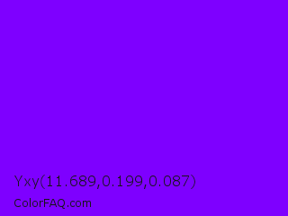 Yxy 11.689,0.199,0.087 Color is a normal violet color and the nearest color is Violet Color Wheel #7f00ff. Hex code #7e00ff and RGB value is rgb(126,0,255). In RGB color space, this color is composed of 49% red, 0% green, 100% blue, In CMYK color space, this color is composed of 51% cyan, 100% magenta, 0% yellow , 0% black , In HSL color space, this color has a hue angle of 270° , 100% saturation and 50% lightness.