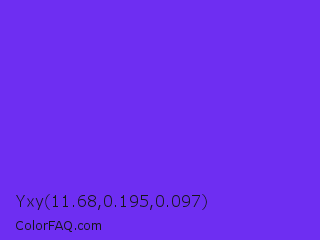 Yxy 11.68,0.195,0.097 Color is a normal indigo color and the nearest color is Blue Violet #8a2be2. Hex code #6e2ef2 and RGB value is rgb(110,46,242). In RGB color space, this color is composed of 43% red, 18% green, 95% blue, In CMYK color space, this color is composed of 55% cyan, 81% magenta, 0% yellow , 5% black , In HSL color space, this color has a hue angle of 260° , 88% saturation and 56% lightness.