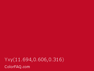 Yxy 11.694,0.606,0.316 Color is a normal red color and the nearest color is Monza #c7031e. Hex code #c10b26 and RGB value is rgb(193,11,38). In RGB color space, this color is composed of 76% red, 4% green, 15% blue, In CMYK color space, this color is composed of 0% cyan, 94% magenta, 80% yellow , 24% black , In HSL color space, this color has a hue angle of 351° , 89% saturation and 40% lightness.