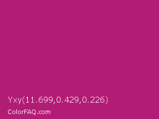 Yxy 11.699,0.429,0.226 Color is a normal magenta color and the nearest color is Hibiscus #b6316c. Hex code #b31c75 and RGB value is rgb(179,28,117). In RGB color space, this color is composed of 70% red, 11% green, 46% blue, In CMYK color space, this color is composed of 0% cyan, 84% magenta, 35% yellow , 30% black , In HSL color space, this color has a hue angle of 325° , 73% saturation and 41% lightness.