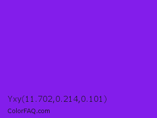 Yxy 11.702,0.214,0.101 Color is a normal violet color and the nearest color is Blue Violet #8a2be2. Hex code #831deb and RGB value is rgb(131,29,235). In RGB color space, this color is composed of 51% red, 11% green, 92% blue, In CMYK color space, this color is composed of 44% cyan, 88% magenta, 0% yellow , 8% black , In HSL color space, this color has a hue angle of 270° , 84% saturation and 52% lightness.