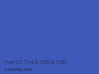 Yxy 11.714,0.195,0.158 Color is a normal blue color and the nearest color is Violet Blue #324ab2. Hex code #3f59ba and RGB value is rgb(63,89,186). In RGB color space, this color is composed of 25% red, 35% green, 73% blue, In CMYK color space, this color is composed of 66% cyan, 52% magenta, 0% yellow , 27% black , In HSL color space, this color has a hue angle of 227° , 49% saturation and 49% lightness.