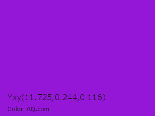 Yxy 11.725,0.244,0.116 Color is a normal purple color and the nearest color is French Violet #8806ce. Hex code #9416d6 and RGB value is rgb(148,22,214). In RGB color space, this color is composed of 58% red, 9% green, 84% blue, In CMYK color space, this color is composed of 31% cyan, 90% magenta, 0% yellow , 16% black , In HSL color space, this color has a hue angle of 279° , 81% saturation and 46% lightness.