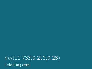 Yxy 11.733,0.215,0.28 Color is a dark cyan color and the nearest color is Blue Sapphire #126180. Hex code #12697d and RGB value is rgb(18,105,125). In RGB color space, this color is composed of 7% red, 41% green, 49% blue, In CMYK color space, this color is composed of 86% cyan, 16% magenta, 0% yellow , 51% black , In HSL color space, this color has a hue angle of 191° , 75% saturation and 28% lightness.