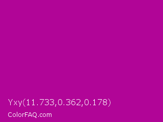Yxy 11.733,0.362,0.178 Color is a normal magenta color and the nearest color is Violet Eggplant #991199. Hex code #b10597 and RGB value is rgb(177,5,151). In RGB color space, this color is composed of 69% red, 2% green, 59% blue, In CMYK color space, this color is composed of 0% cyan, 97% magenta, 15% yellow , 31% black , In HSL color space, this color has a hue angle of 309° , 95% saturation and 36% lightness.