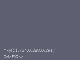 Yxy 11.734,0.288,0.291 Color is a normal blue color and the nearest color is Mid Gray #5f5f6e. Hex code #5e5f70 and RGB value is rgb(94,95,112). In RGB color space, this color is composed of 37% red, 37% green, 44% blue, In CMYK color space, this color is composed of 16% cyan, 15% magenta, 0% yellow , 56% black , In HSL color space, this color has a hue angle of 237° , 9% saturation and 40% lightness.