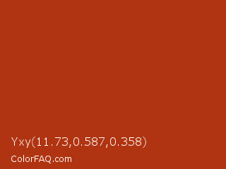 Yxy 11.73,0.587,0.358 Color is a normal red color and the nearest color is Chinese Red #aa381e. Hex code #b03411 and RGB value is rgb(176,52,17). In RGB color space, this color is composed of 69% red, 20% green, 7% blue, In CMYK color space, this color is composed of 0% cyan, 70% magenta, 90% yellow , 31% black , In HSL color space, this color has a hue angle of 13° , 82% saturation and 38% lightness.