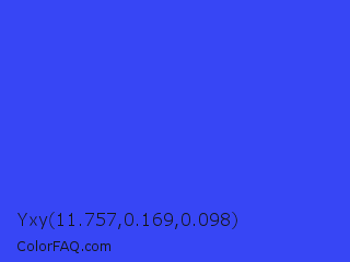 Yxy 11.757,0.169,0.098 Color is a normal blue color and the nearest color is Palatinate Blue #273be2. Hex code #3746f5 and RGB value is rgb(55,70,245). In RGB color space, this color is composed of 22% red, 27% green, 96% blue, In CMYK color space, this color is composed of 78% cyan, 71% magenta, 0% yellow , 4% black , In HSL color space, this color has a hue angle of 235° , 90% saturation and 59% lightness.