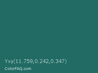 Yxy 11.759,0.242,0.347 Color is a dark cyan color and the nearest color is Genoa #15736b. Hex code #216b64 and RGB value is rgb(33,107,100). In RGB color space, this color is composed of 13% red, 42% green, 39% blue, In CMYK color space, this color is composed of 69% cyan, 0% magenta, 7% yellow , 58% black , In HSL color space, this color has a hue angle of 174° , 53% saturation and 27% lightness.