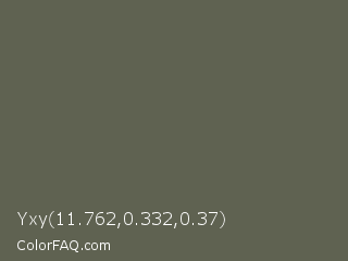 Yxy 11.762,0.332,0.37 Color is a normal lime color and the nearest color is Chicago #5d5c58. Hex code #5f6251 and RGB value is rgb(95,98,81). In RGB color space, this color is composed of 37% red, 38% green, 32% blue, In CMYK color space, this color is composed of 3% cyan, 0% magenta, 17% yellow , 62% black , In HSL color space, this color has a hue angle of 71° , 9% saturation and 35% lightness.