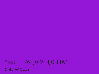 Yxy 11.764,0.244,0.116 Color is a normal purple color and the nearest color is French Violet #8806ce. Hex code #9416d6 and RGB value is rgb(148,22,214). In RGB color space, this color is composed of 58% red, 9% green, 84% blue, In CMYK color space, this color is composed of 31% cyan, 90% magenta, 0% yellow , 16% black , In HSL color space, this color has a hue angle of 279° , 81% saturation and 46% lightness.