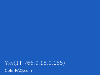 Yxy 11.766,0.18,0.155 Color is a normal blue color and the nearest color is Denim #1560bd. Hex code #1a5dbe and RGB value is rgb(26,93,190). In RGB color space, this color is composed of 10% red, 36% green, 75% blue, In CMYK color space, this color is composed of 86% cyan, 51% magenta, 0% yellow , 25% black , In HSL color space, this color has a hue angle of 215° , 76% saturation and 42% lightness.