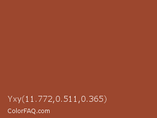 Yxy 11.772,0.511,0.365 Color is a normal red color and the nearest color is Chestnut #954535. Hex code #9c472e and RGB value is rgb(156,71,46). In RGB color space, this color is composed of 61% red, 28% green, 18% blue, In CMYK color space, this color is composed of 0% cyan, 54% magenta, 71% yellow , 39% black , In HSL color space, this color has a hue angle of 14° , 54% saturation and 40% lightness.