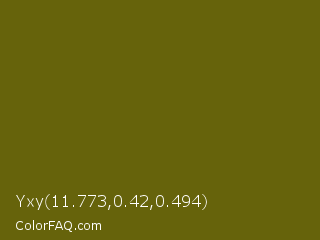 Yxy 11.773,0.42,0.494 Color is a very dark yellow color and the nearest color is Spicy Mustard #74640d. Hex code #66630b and RGB value is rgb(102,99,11). In RGB color space, this color is composed of 40% red, 39% green, 4% blue, In CMYK color space, this color is composed of 0% cyan, 3% magenta, 89% yellow , 60% black , In HSL color space, this color has a hue angle of 58° , 81% saturation and 22% lightness.