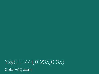 Yxy 11.774,0.235,0.35 Color is a dark cyan color and the nearest color is Genoa #15736b. Hex code #116c64 and RGB value is rgb(17,108,100). In RGB color space, this color is composed of 7% red, 42% green, 39% blue, In CMYK color space, this color is composed of 84% cyan, 0% magenta, 7% yellow , 58% black , In HSL color space, this color has a hue angle of 175° , 73% saturation and 25% lightness.
