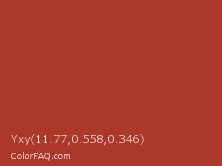 Yxy 11.77,0.558,0.346 Color is a normal red color and the nearest color is Sweet Brown #a83731. Hex code #ad3728 and RGB value is rgb(173,55,40). In RGB color space, this color is composed of 68% red, 22% green, 16% blue, In CMYK color space, this color is composed of 0% cyan, 68% magenta, 77% yellow , 32% black , In HSL color space, this color has a hue angle of 7° , 62% saturation and 42% lightness.