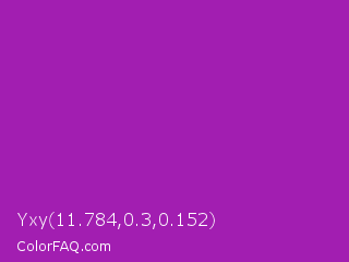 Yxy 11.784,0.3,0.152 Color is a normal magenta color and the nearest color is Violet Eggplant #991199. Hex code #a21eb1 and RGB value is rgb(162,30,177). In RGB color space, this color is composed of 64% red, 12% green, 69% blue, In CMYK color space, this color is composed of 8% cyan, 83% magenta, 0% yellow , 31% black , In HSL color space, this color has a hue angle of 294° , 71% saturation and 41% lightness.