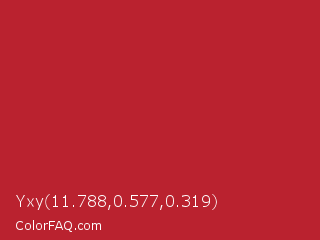 Yxy 11.788,0.577,0.319 Color is a normal red color and the nearest color is Upsdell Red #ae2029. Hex code #ba222f and RGB value is rgb(186,34,47). In RGB color space, this color is composed of 73% red, 13% green, 18% blue, In CMYK color space, this color is composed of 0% cyan, 82% magenta, 75% yellow , 27% black , In HSL color space, this color has a hue angle of 355° , 69% saturation and 43% lightness.
