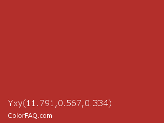 Yxy 11.791,0.567,0.334 Color is a normal red color and the nearest color is Tall Poppy #b32d29. Hex code #b32f2b and RGB value is rgb(179,47,43). In RGB color space, this color is composed of 70% red, 18% green, 17% blue, In CMYK color space, this color is composed of 0% cyan, 74% magenta, 76% yellow , 30% black , In HSL color space, this color has a hue angle of 2° , 61% saturation and 44% lightness.
