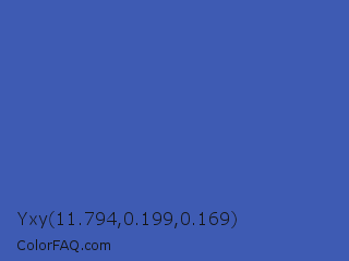 Yxy 11.794,0.199,0.169 Color is a normal blue color and the nearest color is San Marino #456cac. Hex code #3e5bb3 and RGB value is rgb(62,91,179). In RGB color space, this color is composed of 24% red, 36% green, 70% blue, In CMYK color space, this color is composed of 65% cyan, 49% magenta, 0% yellow , 30% black , In HSL color space, this color has a hue angle of 225° , 49% saturation and 47% lightness.