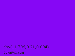 Yxy 11.796,0.21,0.094 Color is a normal purple color and the nearest color is Electric Violet #8b00ff. Hex code #8607f5 and RGB value is rgb(134,7,245). In RGB color space, this color is composed of 53% red, 3% green, 96% blue, In CMYK color space, this color is composed of 45% cyan, 97% magenta, 0% yellow , 4% black , In HSL color space, this color has a hue angle of 272° , 94% saturation and 49% lightness.