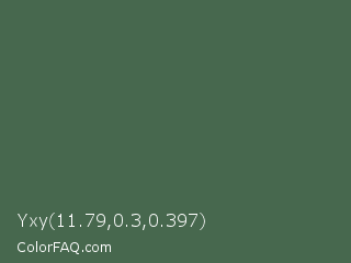 Yxy 11.79,0.3,0.397 Color is a normal green color and the nearest color is Axolotl #4e6649. Hex code #47684e and RGB value is rgb(71,104,78). In RGB color space, this color is composed of 28% red, 41% green, 31% blue, In CMYK color space, this color is composed of 32% cyan, 0% magenta, 25% yellow , 59% black , In HSL color space, this color has a hue angle of 133° , 19% saturation and 34% lightness.